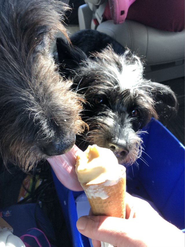Doggos had to go see the vet and get all their shots, so we stopped to get them a treat after. My Grandmother taught our first dog to lick ice cream cones (lick, not bite), and we have continued the tradition. They had to share one vanilla cone, but they don’t care (and I did make sure to switch between so neither endured a cold headache).