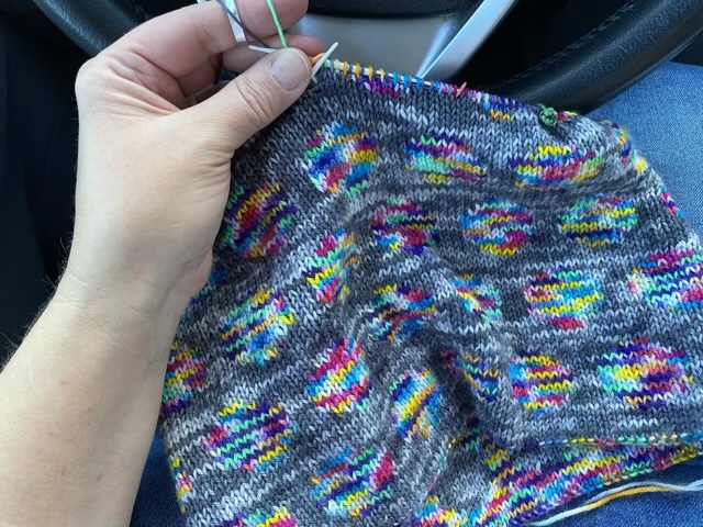 My waiting project is progressing. My original idea was a cowl double knit with polka dots. I chose two variegated yarns, which is making the pattern muddier than I envisioned. On the plus side, it looks like an old school monitor glitch, which is cool in its own right.
