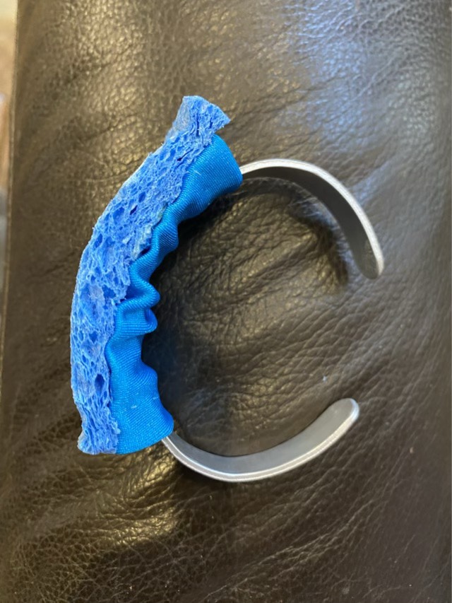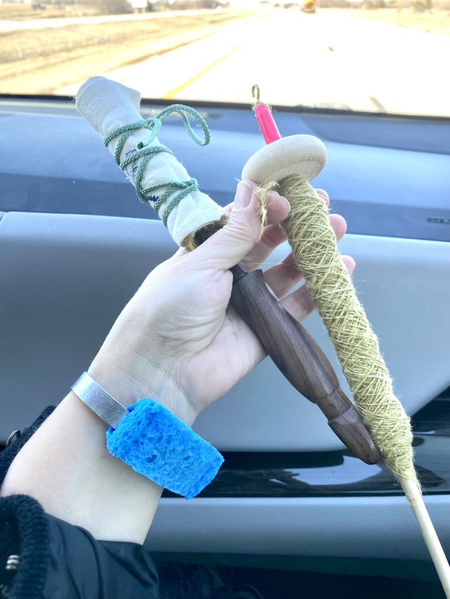 For spinning flax, author Stephenie Gaustad recommends wetting the point of contact between the leader and fibers to be drafted with moistened fingers. To facilitate this, I made a sponge bracelet. I cut a rectangle of sponge, sewed on some swim suit material, and slipped it over a metal cuff-style bracelet.