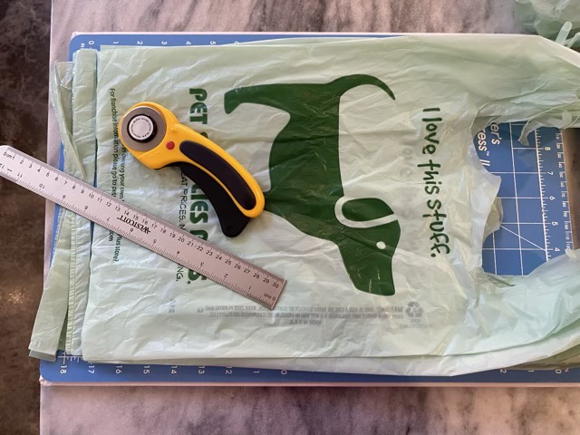 The technique I have been using involves folding and cutting one bag at a time, which is why they have languished on the hook, waiting. I decided to try a different method, using a cutting board and a rotary wheel. I pull each bag flat, which easiest by finding the bottom corner and pulling on the handle, and stack it on the cutting board. Pictured is a stack of five bags. I then used a ruler that is one inch wide and my rotary cutter to cut off the sealed bottom.