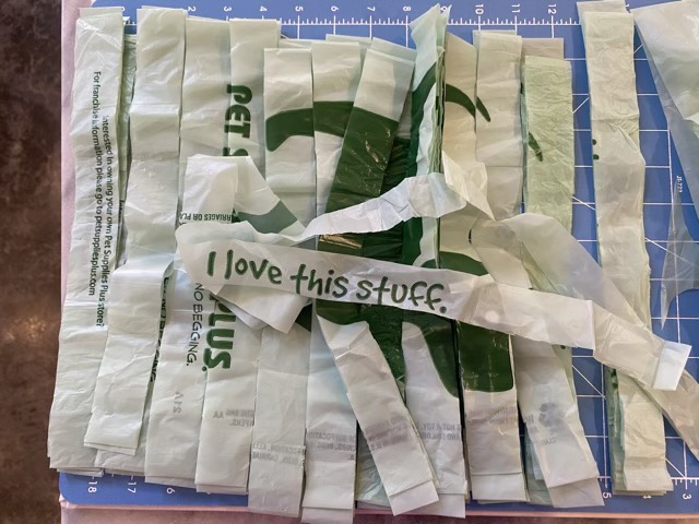 I continue up the bags, cutting one inch strips using the ruler, until I reach the handles. This gives me approximately 60 plastic loops for 13 passes of the cutter. I do discard the bottom and top of the bag. I have cut up to seven bags at the same time comfortably, and could probably go higher, when I’m feeling brave.