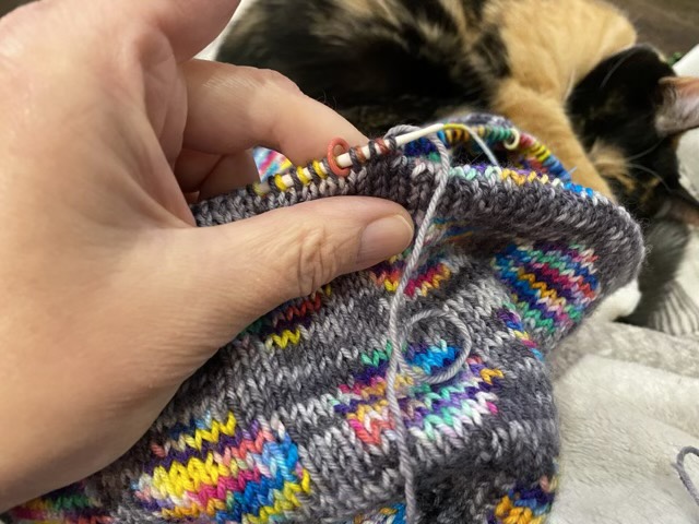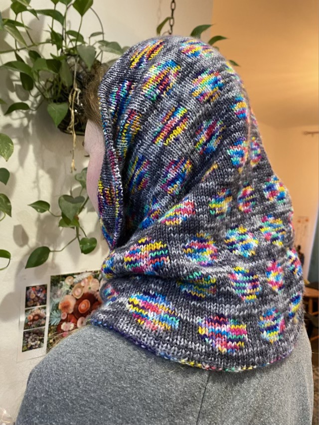 I am calling this finished project (yay finished!) the “Polka Dot Glitch”. It is double knit with “Fiesta!” and “Fade to Black” variegated hand-dyed fingering weight yarns by Bashful Armadillo.