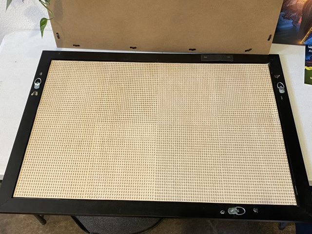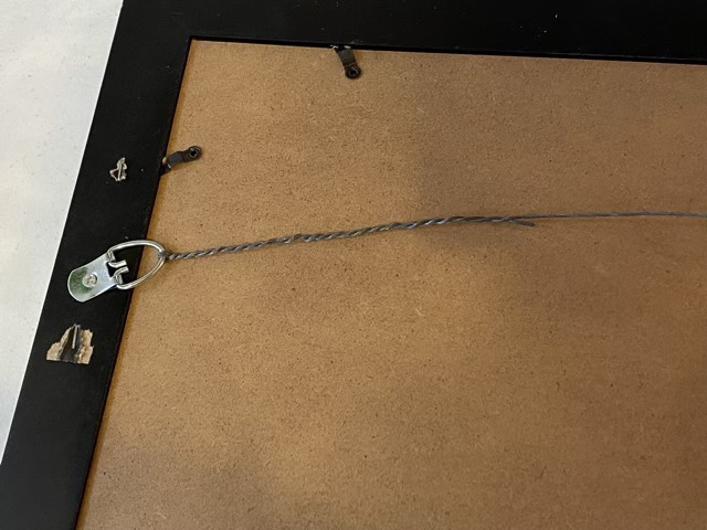 The frame came with attached loops, so I strung some framing wire (multi-stranded steel cable) from loop to loop, and wrapped it on itself on both sides. This makes it much easier to hang and adjust the level of the picture. I used a monkey hook to hang the picture on the wall. I find the monkey hooks to be superior to command strips because small holes are easier to fix than ripped out paint and texture (as can happen if the contact strip is removed too fast).