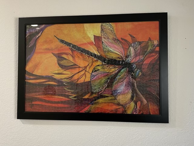 My eldest finished putting together a wooden puzzle adorned with leaves and a dragonfly. It was much too pretty to go back in the box! So I bought a 20×30 inch frame for it, which included the glass and backing. This wood puzzle fit together so well that I was able to gently pick it up and turn it over without resorting to using glue. The puzzle dimensions were just shy of the 20×30 frame measurement, but it fit inside without needing matting. (If you can’t tell, I’m really impressed with the construction of this puzzle.)