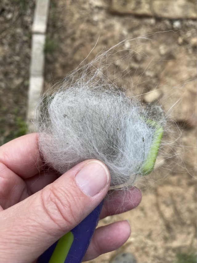 I managed to get five brush strokes across the back of Mr Tom’s Shadow! He still isn’t impressed, but he moves away less each time. Mr Tom loves his brushes, more than treats even, and comes up to me to demand the burrs be removed and his chin be brushed. Shadow comes up to Mr Tom to give him head bumps as I am brushing. That is when I run the brush along his back toward his tail. He moves away, but then comes back to rub against Mr Tom, and subsequently gets another brush. Here is my proof of contact; the picture below shows both white and black hair from the brush.