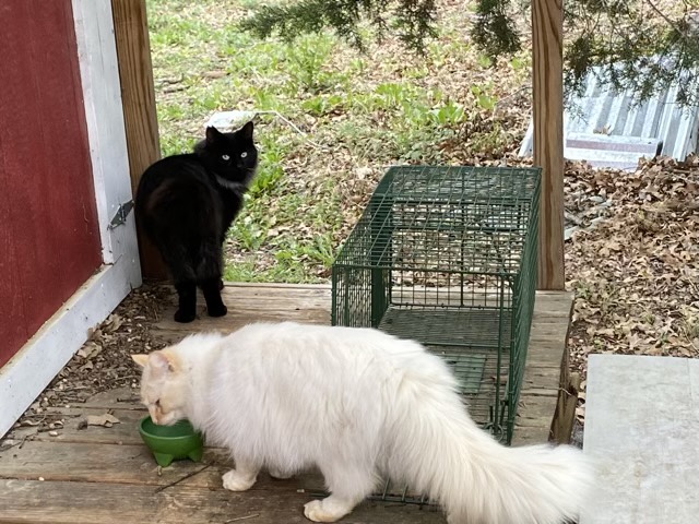 The cage in the second picture is for the female who hangs around with Mr Tom and his Shadow. She will only come up after I am out of reach and not looking. She still needs to be fixed.