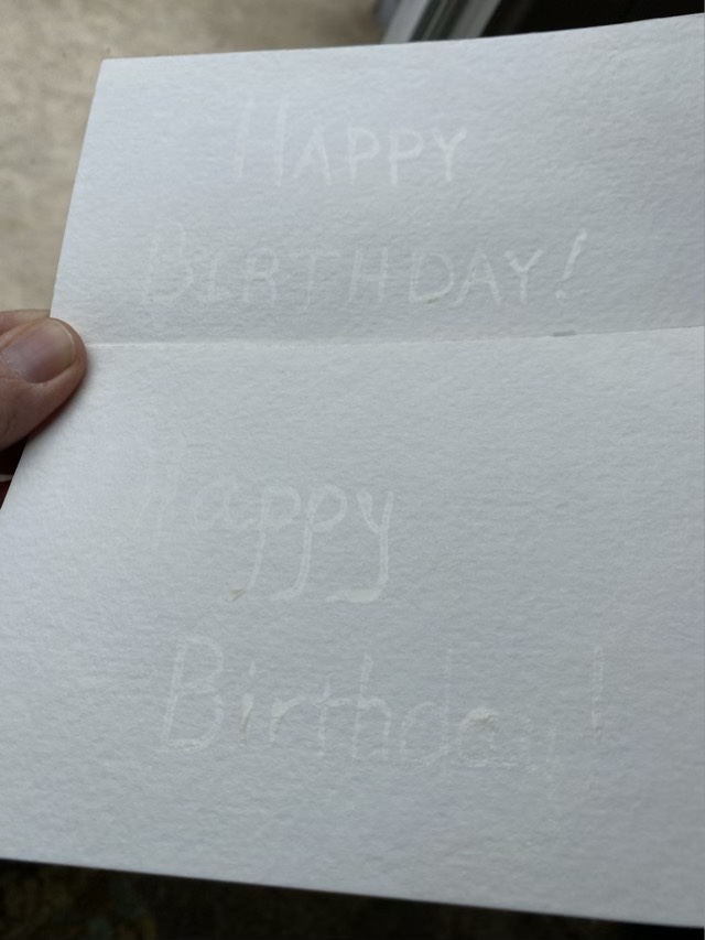 I used a small paint brush to write “Happy Birthday” on two sheets of water color paper, then used a hair dryer to dry the writing.