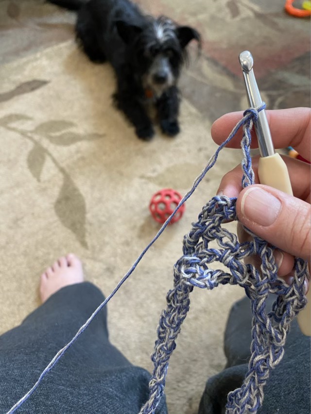 I’ve started a new crochet project. I’m using up yarn from my stash to make what I hope will be a 1960s style duster length vest. We’ll see how much yarn I have. Since the piece is worked from the bottom up, I figure I can keep working until I’m almost out of yarn, then finish the arm holes. At that point I should know about how much yarn that will take. I’m working from a vintage 1969 pattern, and as per my standard method, I’ve deviated. It is an easy thing to pick up and put down, so makes an ideal chair project. I just have to count to five (5 chain stitches to create the net lace). Missy the dog noticed that even though my hands are busy, my feet are free. Good thing that I can kick the ball and still count.