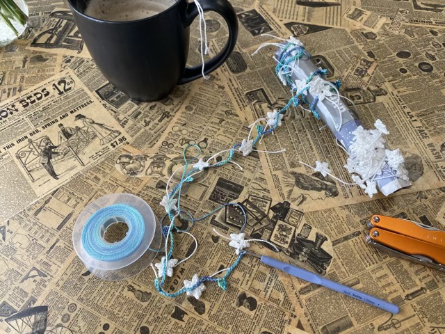 I still haven’t found my weaving shuttle. Hm. So I made one. I’d seen some trapezoidal shuttles on Pinterest, so grabbed a small thin wood sheet and cut a shape using a coping saw. The shape isn’t sellable perfect, but it works quite well, once I sanded it down.