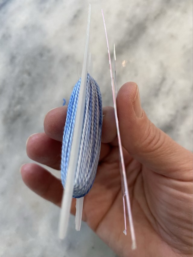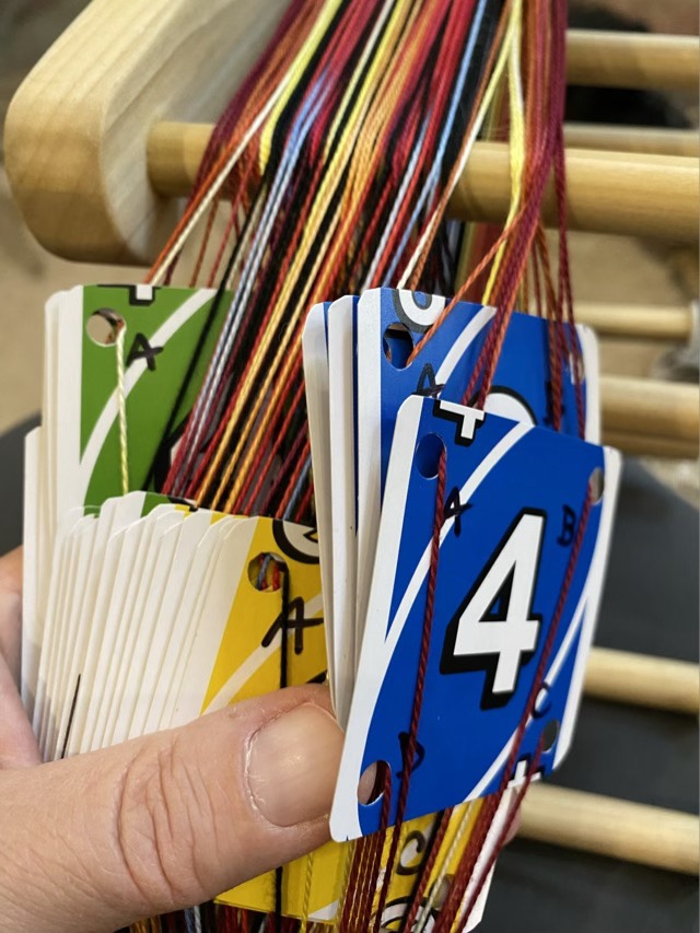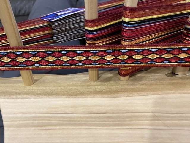 I was then able to weave my new band pattern. It was quite cool to see the muddy mess of warp threads focus into a distinct pattern as I wove. The main experiment in this round was to see if staggering the turnarounds on the edges made the transitions smoother. They do, but it still isn’t as nice as having the edges a consistent direction, but I didn’t have to deal with warp twist. I did discover that I could tell where I was in my pattern by when the “A”s lined up. Every fourth turn, the cards line up, and since the pattern is based in 4, it meant I only had to move my pattern marker every fourth line. I need multiple cues to remember where I am in a pattern; sometimes I forget to move my marker.