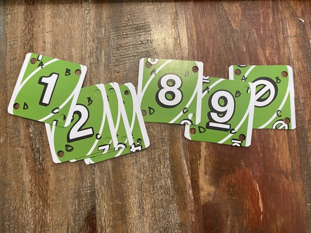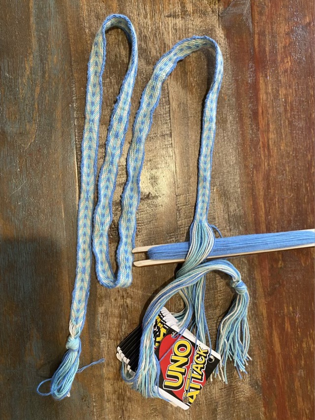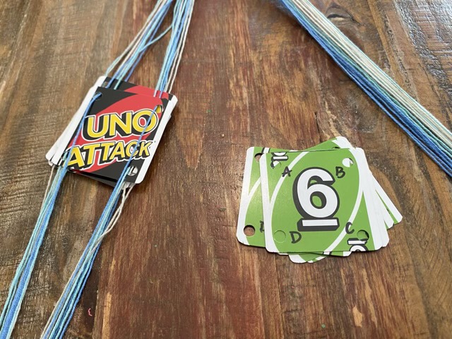 I caved. I’ve been seeing bands made by tablet weaving for years, but didn’t see why I should expend the effort. It makes a strip of fabric, a small thing, what’s the point? Curiosity got the better of me, and I found instructions here to get started without buying anything. I made my “tablet” or cards from old UNO cards (we have SO many different decks), which conveniently are already numbered.