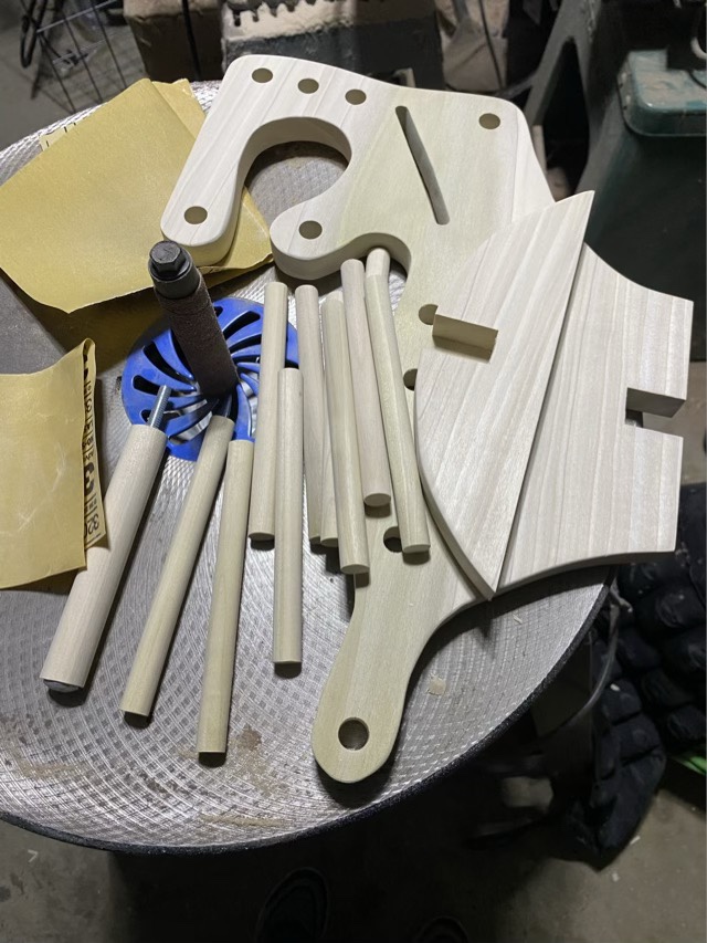 For the posts, my limiting factor was the length of the carriage bolt. I could make the 1/2” posts 6” long, but the 3/4” tension rod needed the carriage bolt to be accessible on the back of the loom. So the rods had to be 5 3/4”. I drilled a quarter inch hole through the 3/4” dowel, and threaded in the carriage bolt, pounding in the last bit to lock it in. All the parts were sanded down successively to 320 grit.