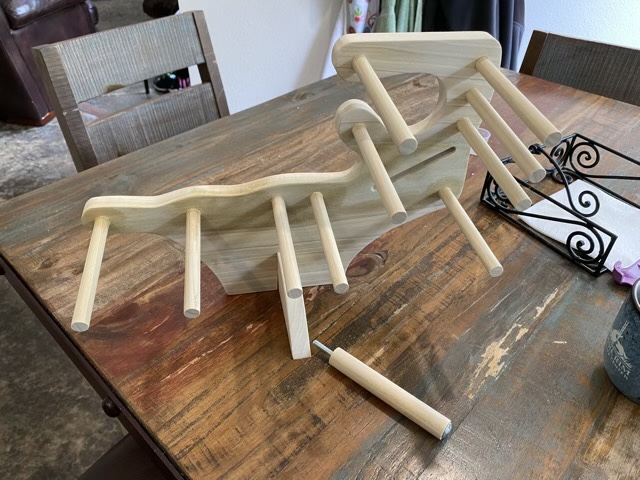 To secure the rods into the loom body, I applied a thin layer of wood glue at the bottom, and used a rubber mallet to pound the dowels into the holes until they were flush with the back. Before the glue dried, I wiped the whole loom down with a wet cloth to both remove the excess glue, and raise the wood grain. When the water dried, I sanded everything down again with 320 grit.