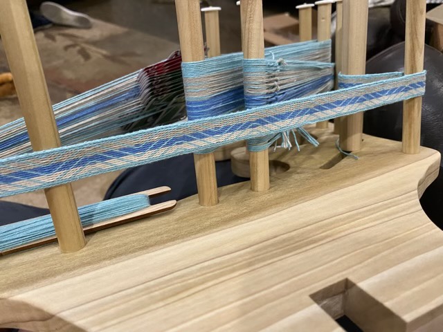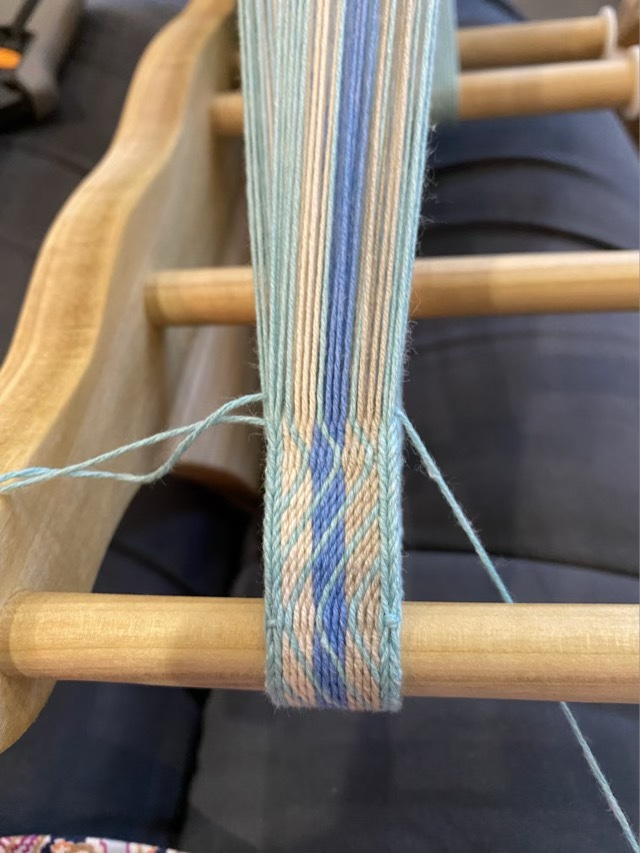 Aside from the twist issue, the weaving is going well. The tension post works, the pegs are solid (I have one peg that didn’t come out perfectly straight, but it doesn’t seem to harm the weaving at this width). Now to weave for awhile (but not too long because it goes fast).