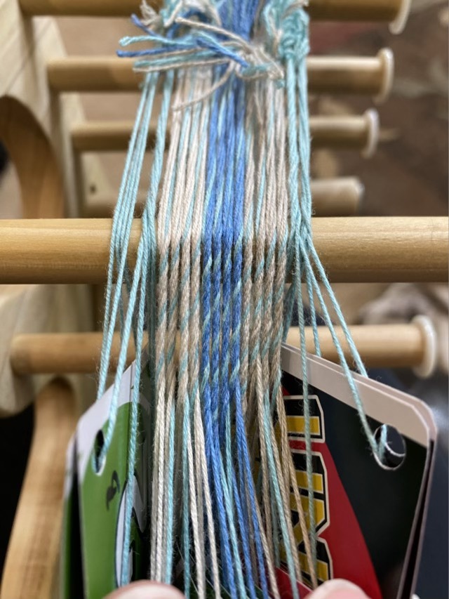 Time to test my inkle loom! I picked a tablet weaving pattern that had an easy 12 turns forward, 12 turns back progression for my test. I warped the loom with a cotton blend yarn in four colors. There are several ways to warp an inkle loom. For this first test, I did four strands at a time (one for each corner of the card), and used a square knot to tie the ends together.