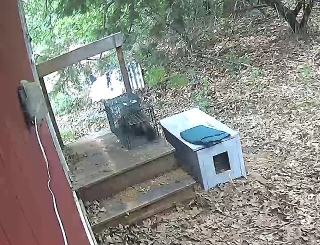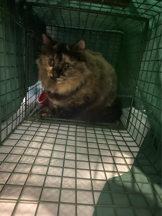 The calico that has eluded me for so long is finally trapped. I changed tactics, setting up a cage behind the coop, with a camera monitoring, and taking out treats once a day. Then on trapping day I set out the good tuna in the cage and … nada. No interest in tuna. So I retrieved the tuna, as she stared at me an meowed, and gave her what she wanted: Meow Mix. Really? Ok. It worked. She went into the cage as I watched the camera footage on my phone, I pulled the string holding the stick, and … snap. The line broke. The stick didn’t move. She didn’t even notice. What a charmed cat.