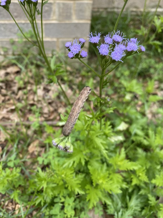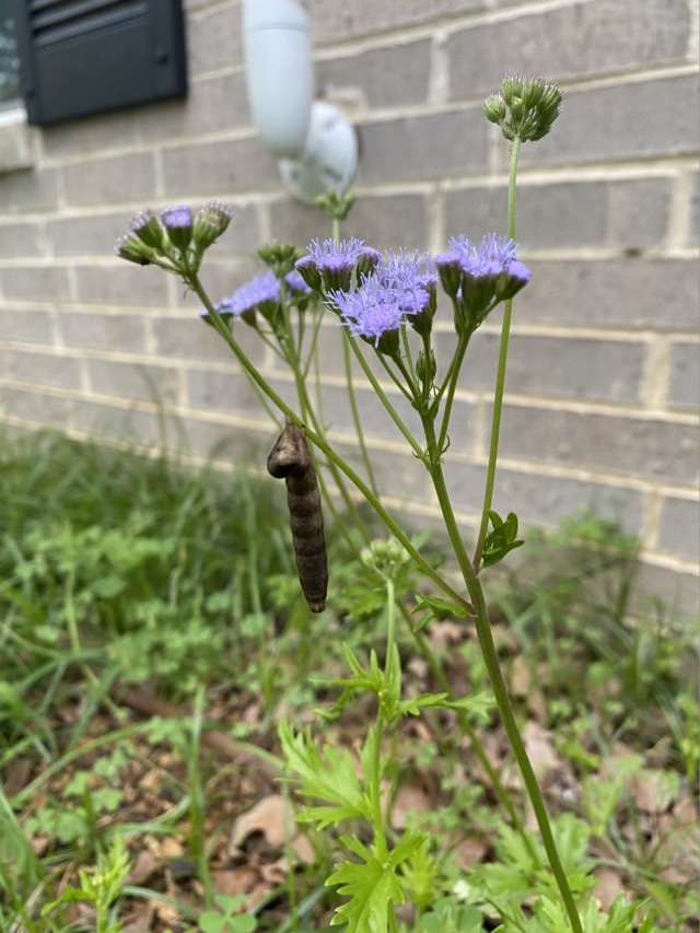 I thought we were going to have a front row seat for metamorphosis; I found a caterpillar crawling up a stem of our Gregg’s Mist flowers. These plants are in the front flower bed and we pass them daily.
