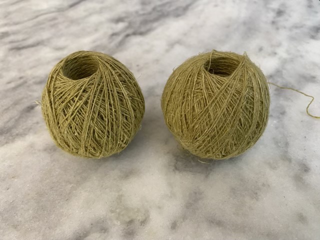 I plied the two balls together to even out the thickness differences. Despite weighing out the roving, the balls were different weights, but I solved the excess issue by doubling up the leftover. I plied using my spinning wheel. Flax when spun is called linen. I suppose I should use that term for my yarn!
