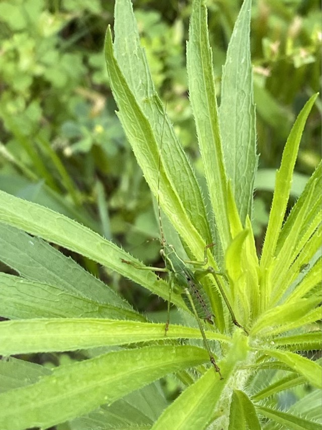 I like the composition of this photograph. At first there is just a field of green, then the Katydid picked out against the leaves, then the gap in leaves and the insect staring into the beyond, one antennae reaching down into the void. Is it going to jump? (Well, it is a Katydid.) Is it going to jump before I can snap the photo (luckily no).