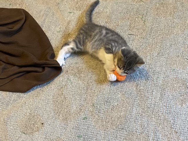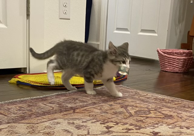 The kitten likes to carry things. He especially likes to carry fun skittery things to new locations to make them skitter again.