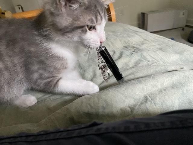 He likes the red light game, and tried to take that from me and carry it off. He can’t work the button, but the chain makes nice noises.