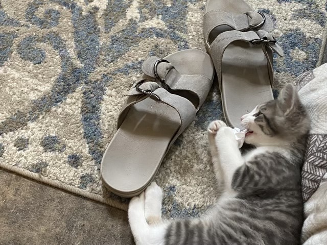 I personally do not like my nose to get up close and personal with my shoes. Thor the kitten loves everyone’s shoes, which I’ve heard and read is normal kitten behavior. He isn’t small enough to crawl inside, but he’ll stick his head in, or take his toy over to the shoes to play. If I’ve been outside, he will come give my shoes a thorough sniff, gathering info. Cats and dogs have much better scent receptors than humans, and are able to get more information from those invisible particles than we can. Familiar scents can also be a comfort (which happens to humans as well).