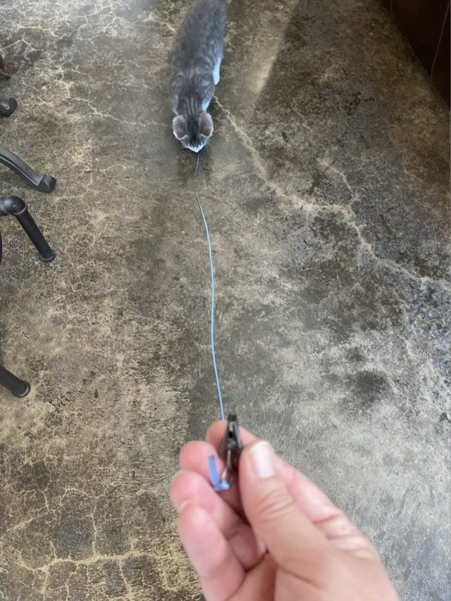 The Texas summer is ramping up, and I don’t like walking when it is hot outside. Luckily, I have a large kitchen counter with room to walk circuits in the house. To keep the kitten occupied, I tied a ribbon to a small clip and clipped it on the back of my shirt.