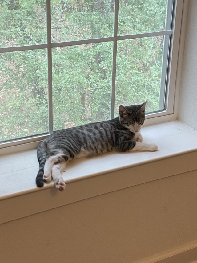 Thor the 4-month-old kitten is definitely growing. It seems like every time I turn around he looks bigger. He recently found his way back up to the windowsill where he first lived in our house, so I snapped a picture for size comparison.