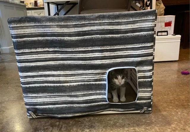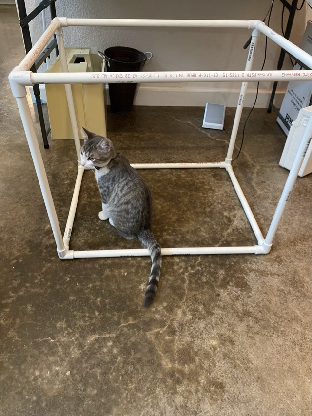 We started by taking measurements, then making a PVC frame. We already had the 1/2” PVC pipe and the socket tees, so it was just a matter of cutting to size. Thor the kitten was particularly found of sitting inside the “box” even if it was only an outline. We purchased 2 yards of household fabric, which is thicker than calico fabric or quilting fabric. To keep the cover in place, I made button tabs that wrap around the bottom pipe.