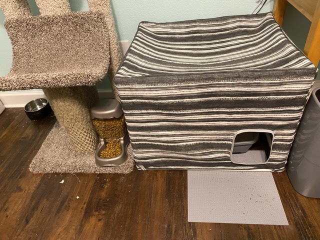 We’ve moved Sophie the cat into a new room with her human. To provide her all she needs, without having to deal with the kitten, she has a litter box as well as food, water, and a climbing tree. The litter box was a little too open for her though, so my eldest suggested we make a box to go over it to give her some privacy.