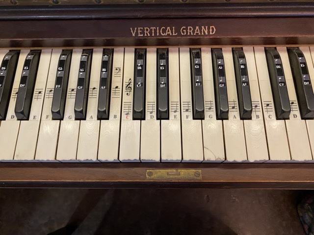 Photo description: Antique piano keys from D3 to D5, with chips in the ivory and note labels on the keys, and “VERTICAL GRAND” in gold.