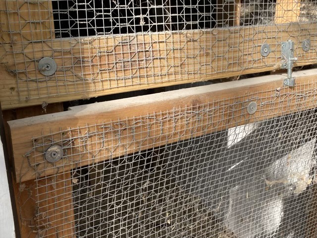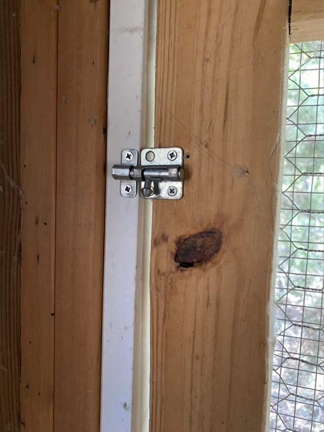 I made a screen door from 2x4s a hardware cloth so during our hot summers I could let a breeze from the cooler woods pass through the coop. It really helps. A regular screen door wouldn’t hold up to raccoons, and neither would poultry wire, which is why, when I decided to leave solid door open at night, I added hardware cloth. The door halves are secured with latches and locks, but the raccoons have been pushing at the bottom right corner of the door until the opposite joint gave way. The chickens are fine, the raccoons still couldn’t get in, but I needed to reinforce the door. I fixed the joint with two new screws, added a new latch on the inside top, replaced a couple of the hinge screws with longer screws, and put a big rock inside at the bottom of the door.