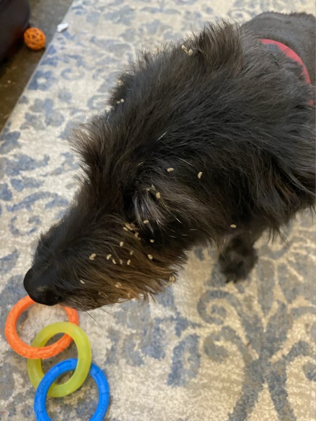 Photo description: Black shaggy dog with twenty plus small cream-colored seed pods on his face.