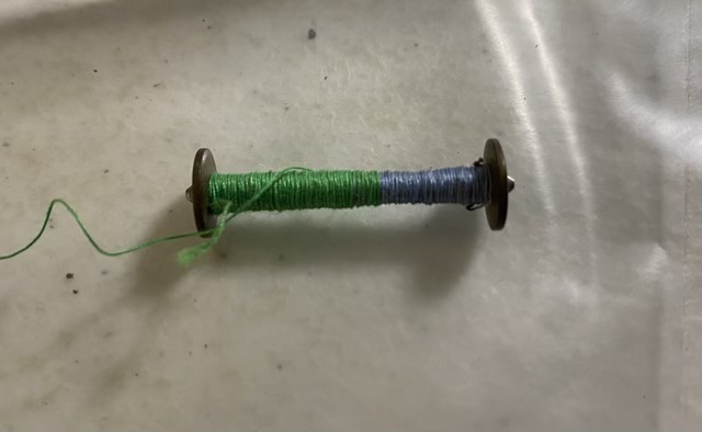 Photo description: Long bobbin wrapped with green thread over blue thread.