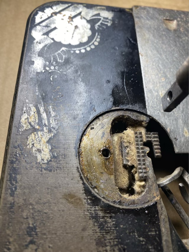 There are YouTube videos of machines in worse states. I know this one was well used, and I want to keep as much of the patina as I can. The black finish flakes off when it is touched, so I need to be very careful not to remove what decoration is left. This will definitely be an ongoing project, and I’ll post about interesting things as I find them.