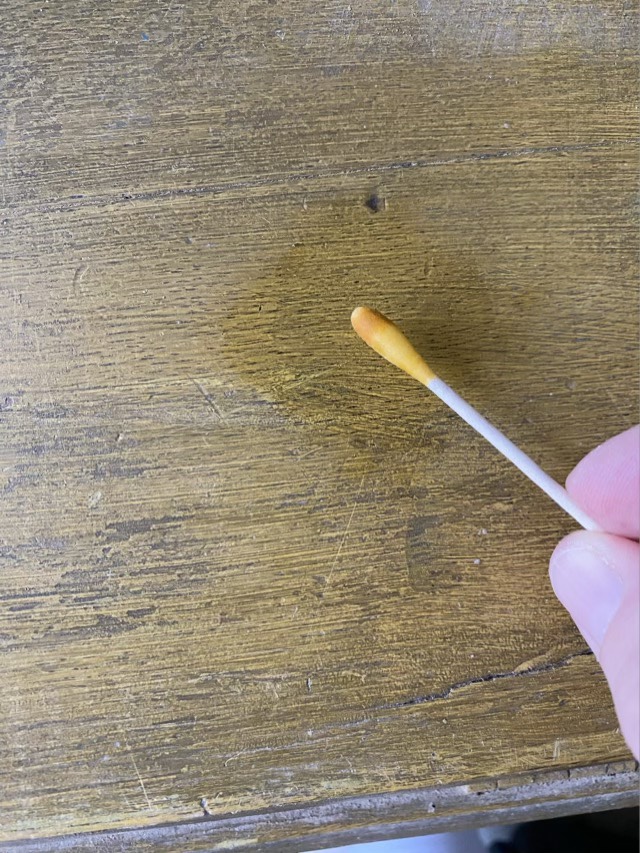 Photo description: Antiqued yellow wood surface showing a wet round area and a yellow swab.