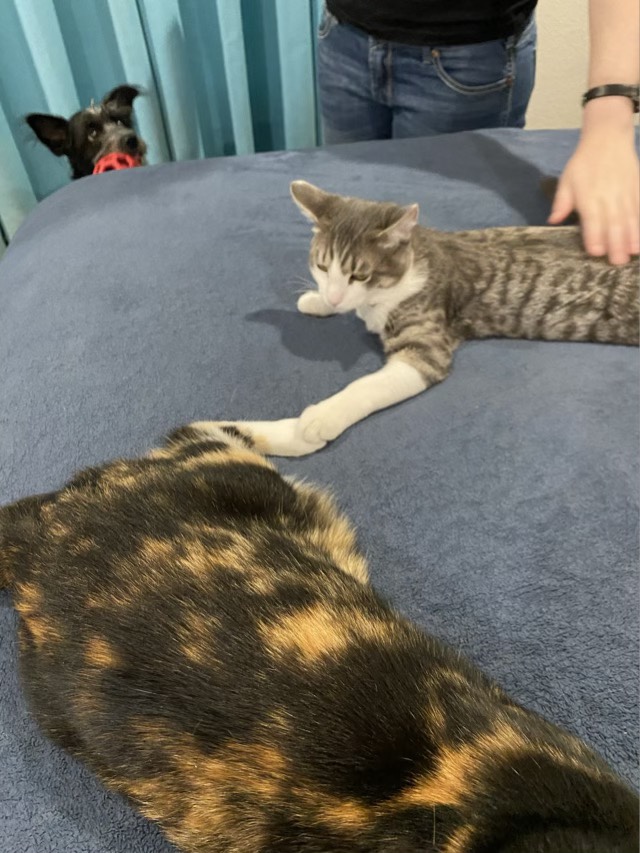 Thor the kitten has picked up on the vibe Izzy the cat sends out and usually gets out of her way, except when he doesn’t. He likes to push his luck when he can. My eldest was giving both Izzy and Thor scratches and he decided to reach out and touch Izzy. She didn’t do anything for awhile, so he kept his paw there until she noticed and told him off. Kittens.