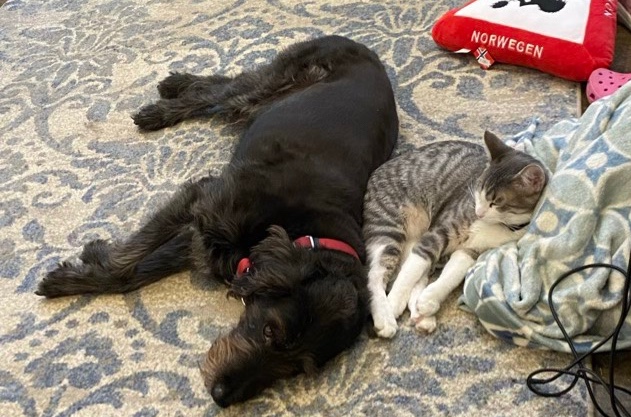 I’m not entirely sure Griffin the dog knew he snuggled Thor the kitten. It seemed very casual. Normally Griffin doesn’t put up with cuddles, scratches yes, cuddles not for long, even from humans. He’ll put up with Missy being close when they are in the car, or wrestling, but nothing that could be called a cuddle. Which makes me think this was unintentional. I’m very interested to see what happens when it gets cold around here.