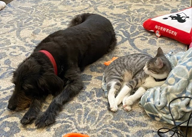 Photo description: 50-pound black dog laying on a patterned rug, six inches away from a gray tabby kitten also laying on the floor with a blanket.Photo description: same dog, same cat, same floor, dog is now in his side, pressed up against the kitten. Both have their eyes closed.