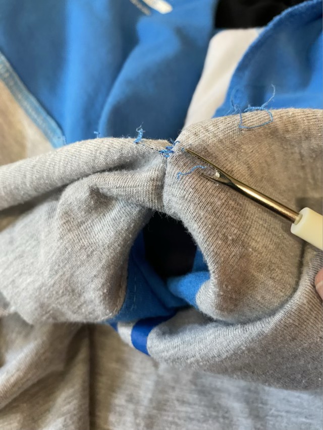 My youngest has a favorite shirt that was getting snug. To prolong the life of the shirt and make her happy, I added a gusset to the sides and up through the arm. First I picked out the side seams about to the elbow.