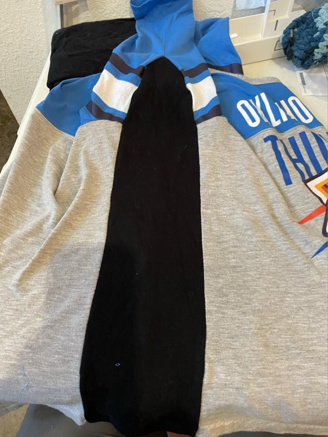 I had her try on the shirt at this stage to see how wide the gusset needed to be cut. Then I cut long rectangles of a similar weight black knit fabric and tapered the end by the elbow.