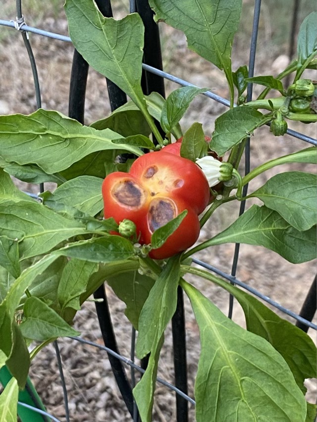 This summer has been hot, so very hot. Our plants and yard have definitely taken a hit and are looking quite sad. I was surprised therefore to find that the pepper plants have actually been producing peppers. Small, yes, but still there. I saw a couple that had turned red and started to decay. These were mid-planter and high up against the fence. Where the dog can’t reach. Ah. That is where all the rest of the peppers went. To test my hypothesis, I tossed this pepper to him. He picked it up and took it off to eat it. Yup. Pepper pup. Sigh.