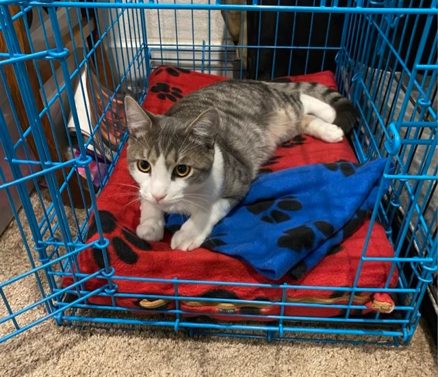 Photo description: Gray Tabby cat laying in a blue dog crate, filling most of the 2×3 foot pad.