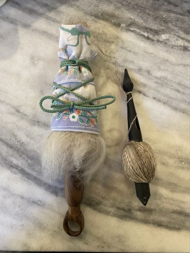 Photo description: Rosewood ring distaff dressed with a blended carded fiber, handkerchief, and cord in a inverted cone shape (left). 3D printed Tough resin spindle with single spun yarn wound nostepinne style (right).
