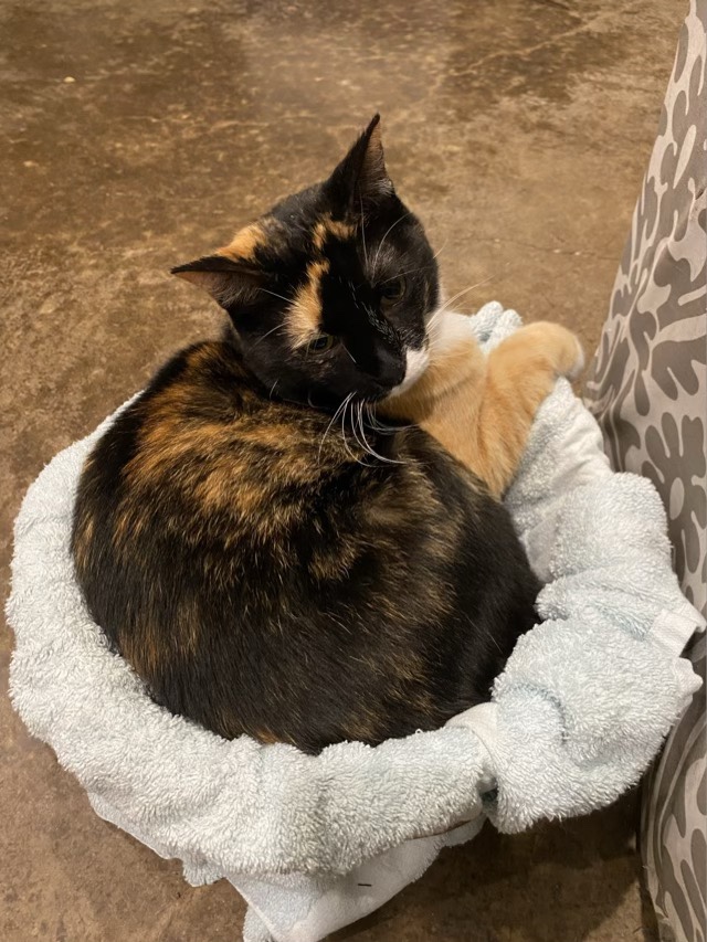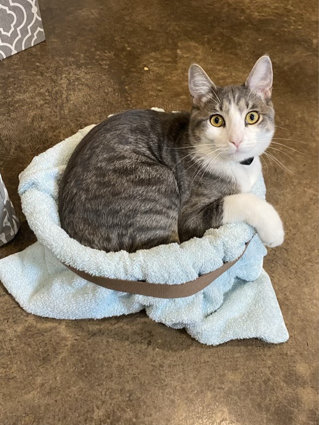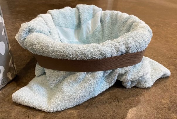 To keep the towel in place and not subject to kitten wiles, I sewed together the ends of a piece of wide elastic to make a stretchy band that goes around the towel and basket.