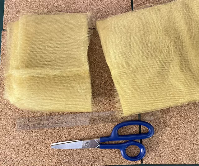 I have been experimenting with nylon tulle fabric (fine mesh fabric, usually in the bridal section). My sewing machine cleaning instructions include using this kind of fabric to gently clean screw threads. If it can handle that kind of work, scrubbing dishes without scratching should be a breeze. I ordered 15 yards, and chose the gold color. I tried cutting narrow strips, but found that sections about 6-7” inches wide worked well to crochet bulky scrubbies. I used leather shears to cut off a section of the bolt. (I’ve since found out that tulle comes in 6” widths in the ribbon section, so we’re going to store that info away for later.)
