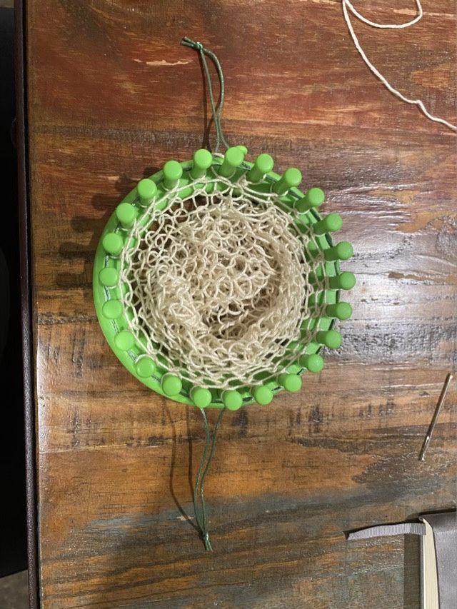 I have found a use for my knitting looms: string bags. I had some acrylic Luster Sheen yarn by Coats and Clark in my stash, and I probably inherited it since the price tag is from Woolworth for $1.49! It is strong and thin, which is great for string bags. I follow the included instructions to start knitting. These looms recommend a twisted stitch, which also works better for bags as they retain their spacing better. After the first pass, I run the tail through the first round to close off the bag. The end won’t completely close until the fifth round or so, but it is easiest to find the loops after that first yarn over. I then continue to knit until I have about 12 inches of fabric, pulled straight. To finish the bag, I run two lengths of satin cord through the last round to make drawstrings.