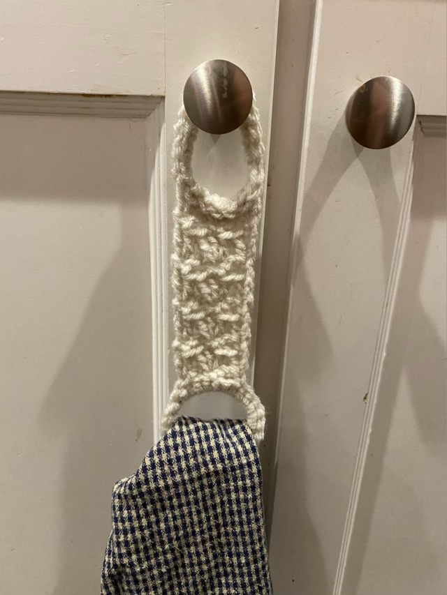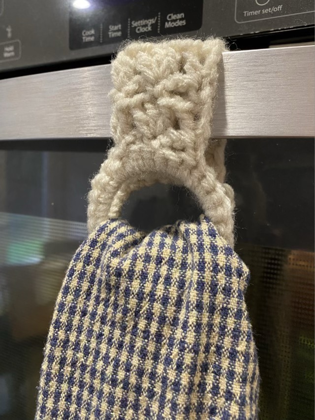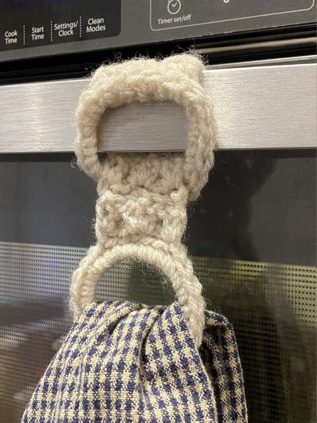 Here is a versatile little towel holder! It uses one metal ring, which is covered with single crochet stitches, a band that can be any pattern of stitches with a 2-4 repeat, and a soft loop made by making a chain long enough to go around the metal loop, then is also covered in single crochet stitches.
