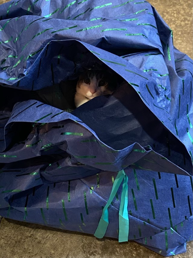 Oh, wrapping presents for the holidays is going to be interesting. I got out my bag of bags to get started, and Thor the cat thought that was the neatest thing ever and crawled right in. He stayed there, rustling about, for an hour. Occasionally he would reach a paw out at an unsuspecting passerby, or attack through the fabric. Here is a video clip.