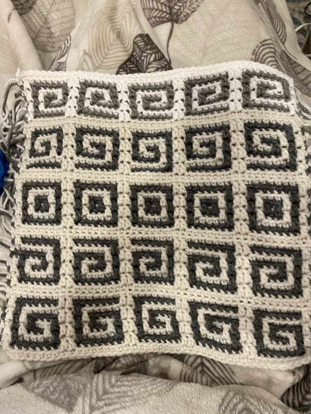 Photo description: Gray and cream crochet square with rows of spirals in different orientations and square bullseyes along the center row. There are a couple errors in the execution.